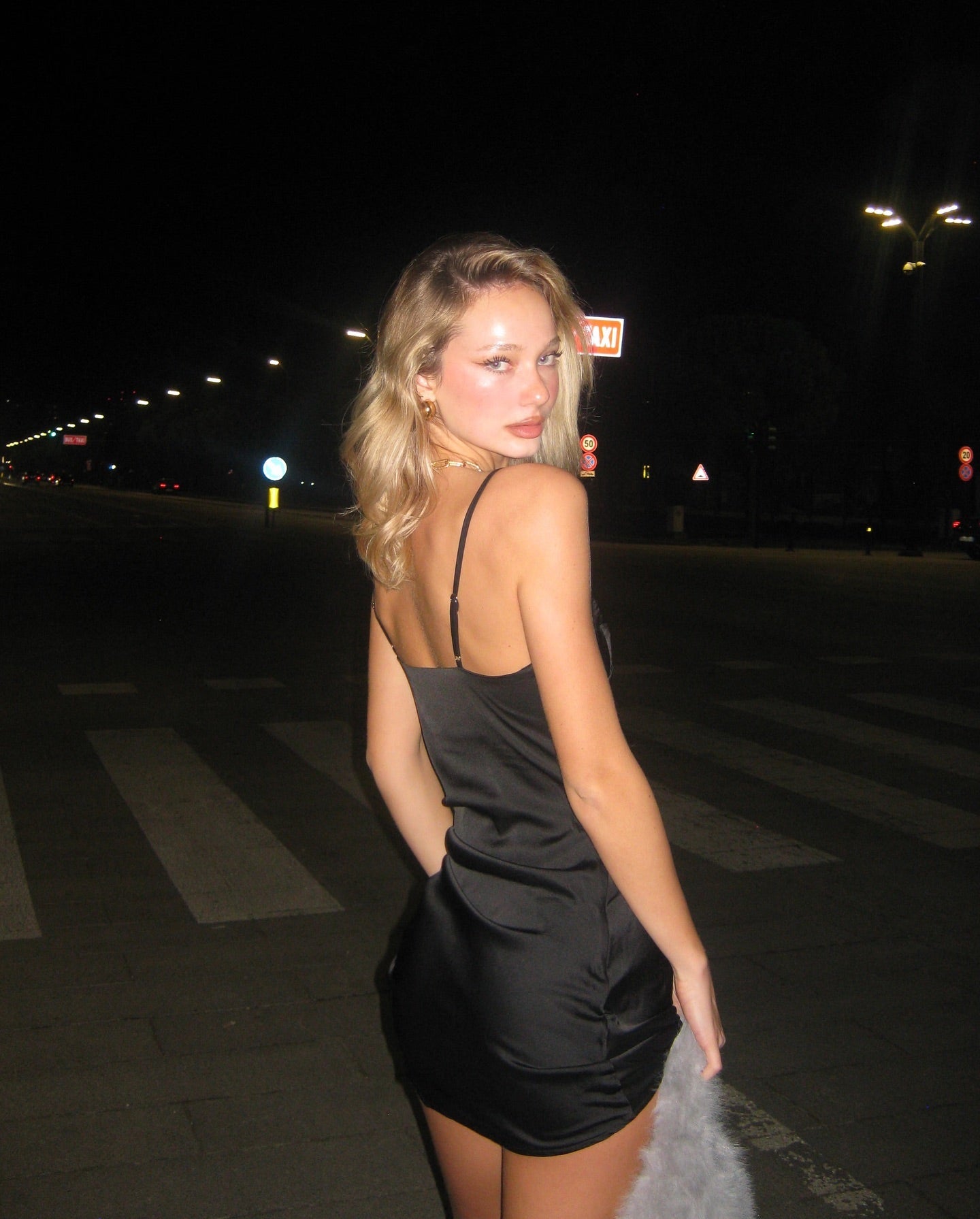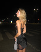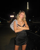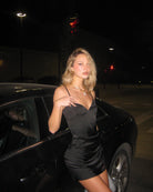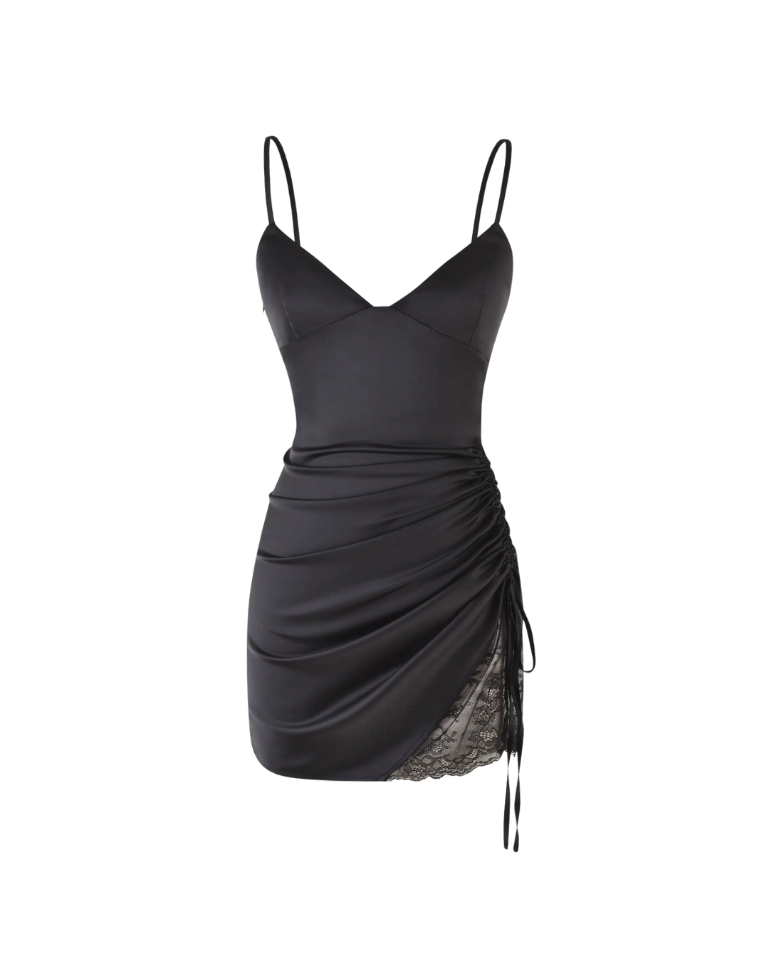 The Saint Mini Dress is crafted from smooth black satin with adjustable gathered sides and a sheer lace panel that adds subtle contrast. Designed with shaped bust cups for support and a close, body-skimming fit, it features functional side channels that let you adjust the length. Slim adjustable straps complete the look.