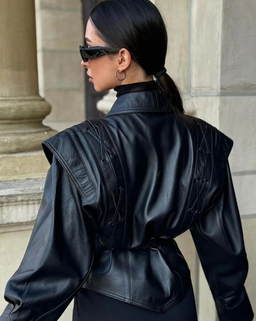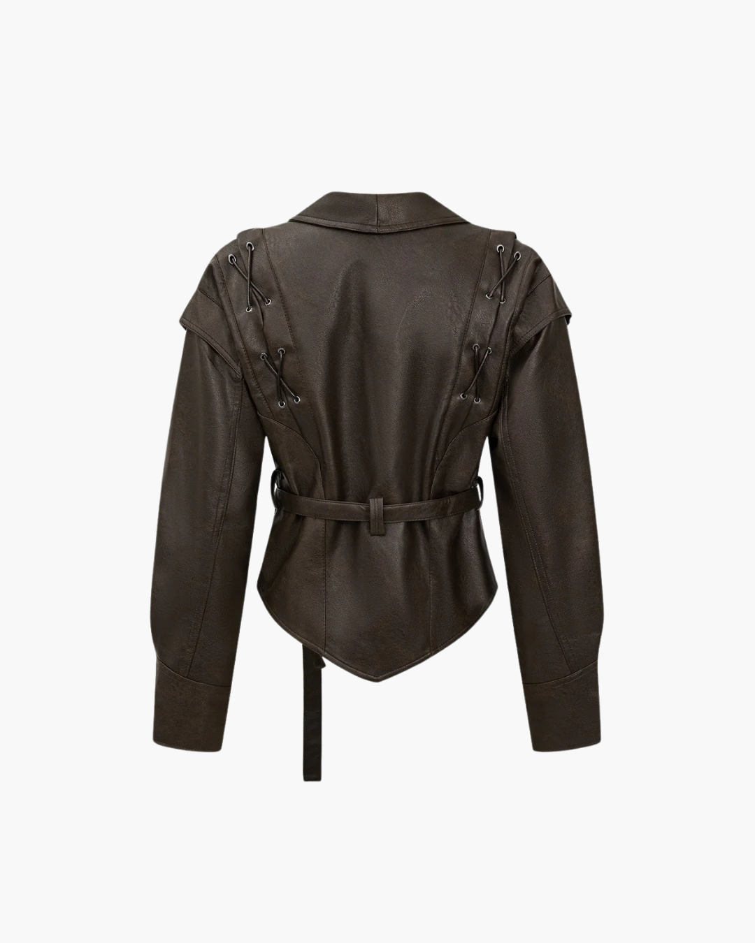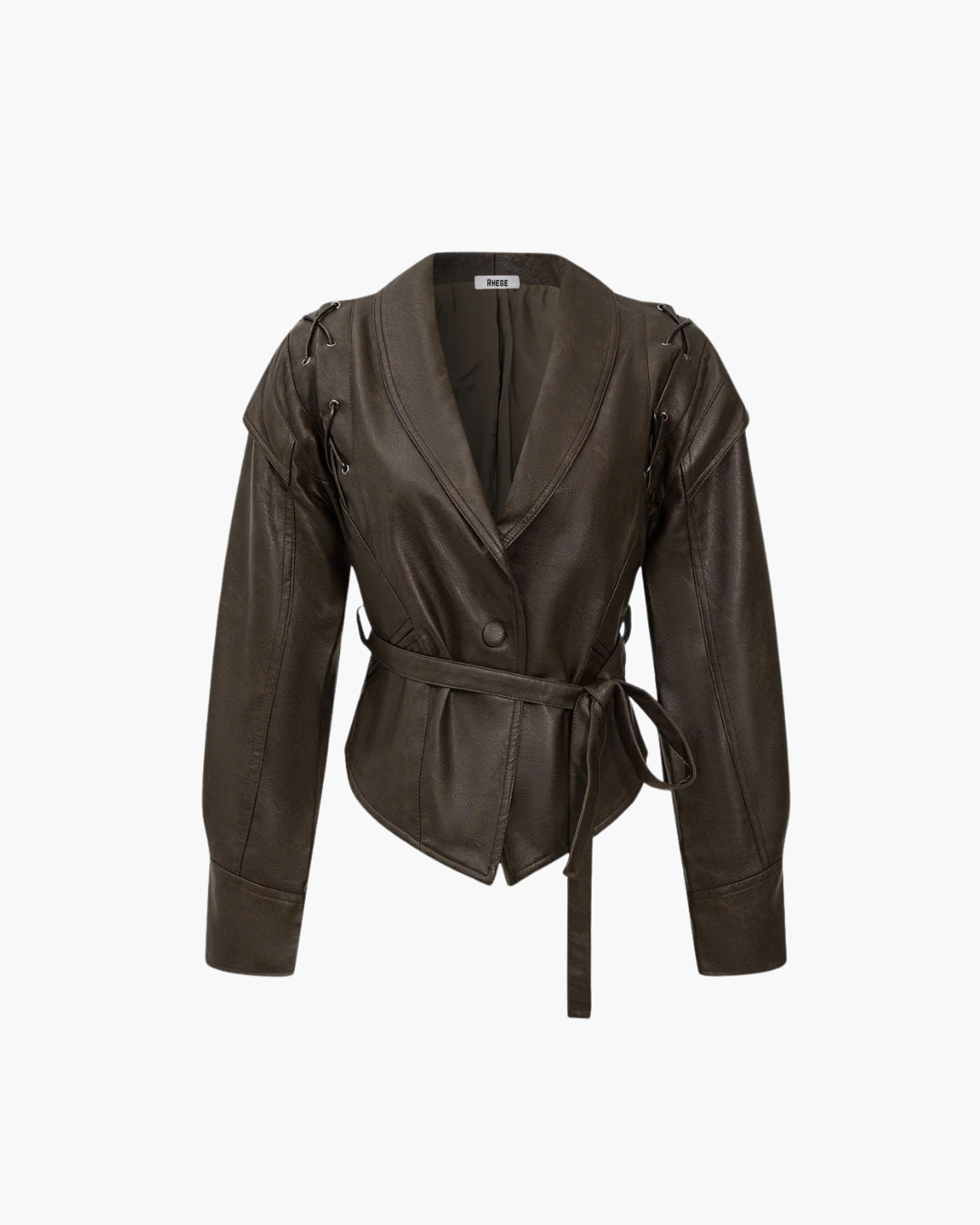 The COUPE jacket is cut from sculpted vegan leather with a soft matte finish and detailed with tonal lace-up stitching along the shoulders and back. Designed with a wide lapel, structured shoulders, and a waist-cinching tie belt, it brings shape and confidence to any look.