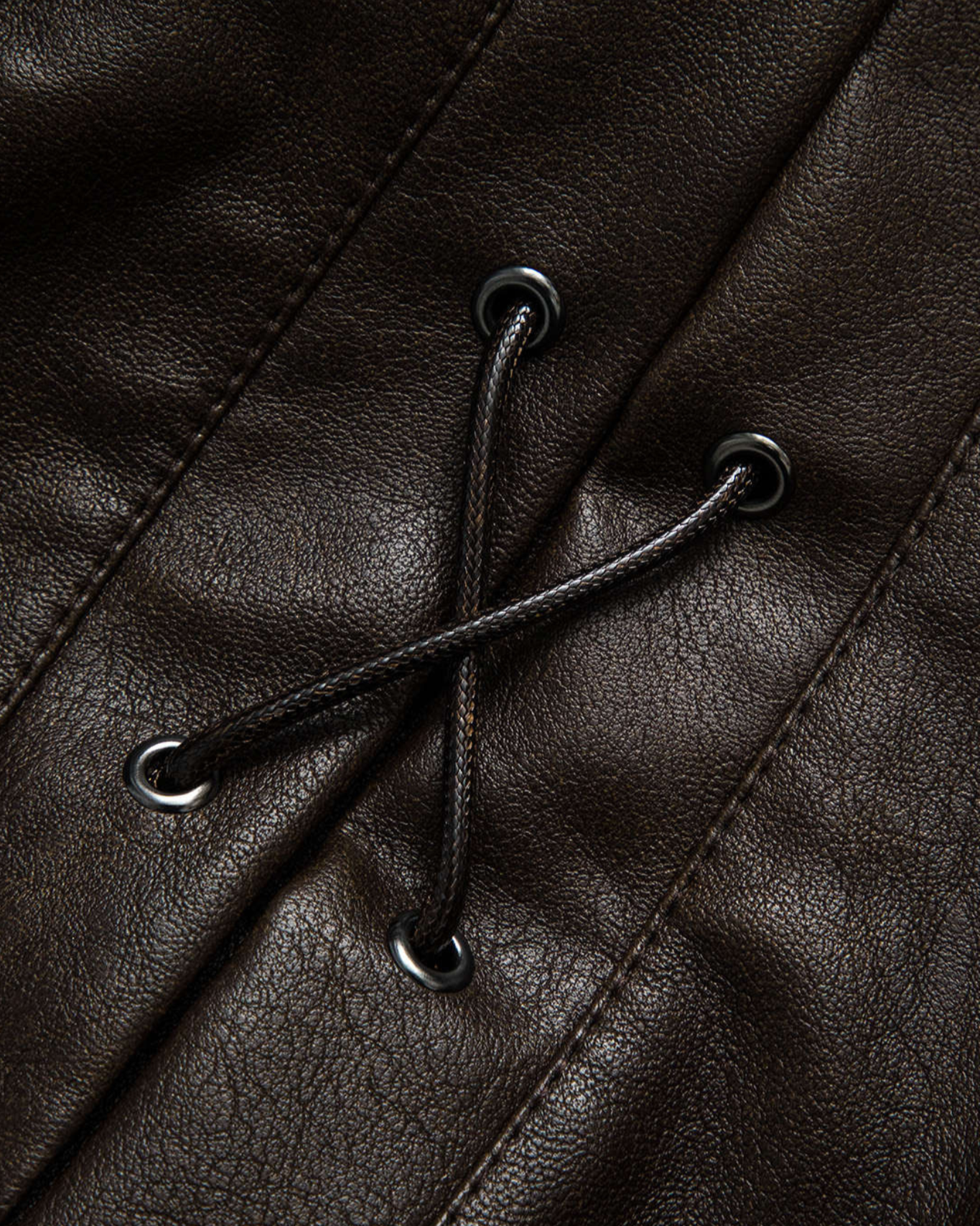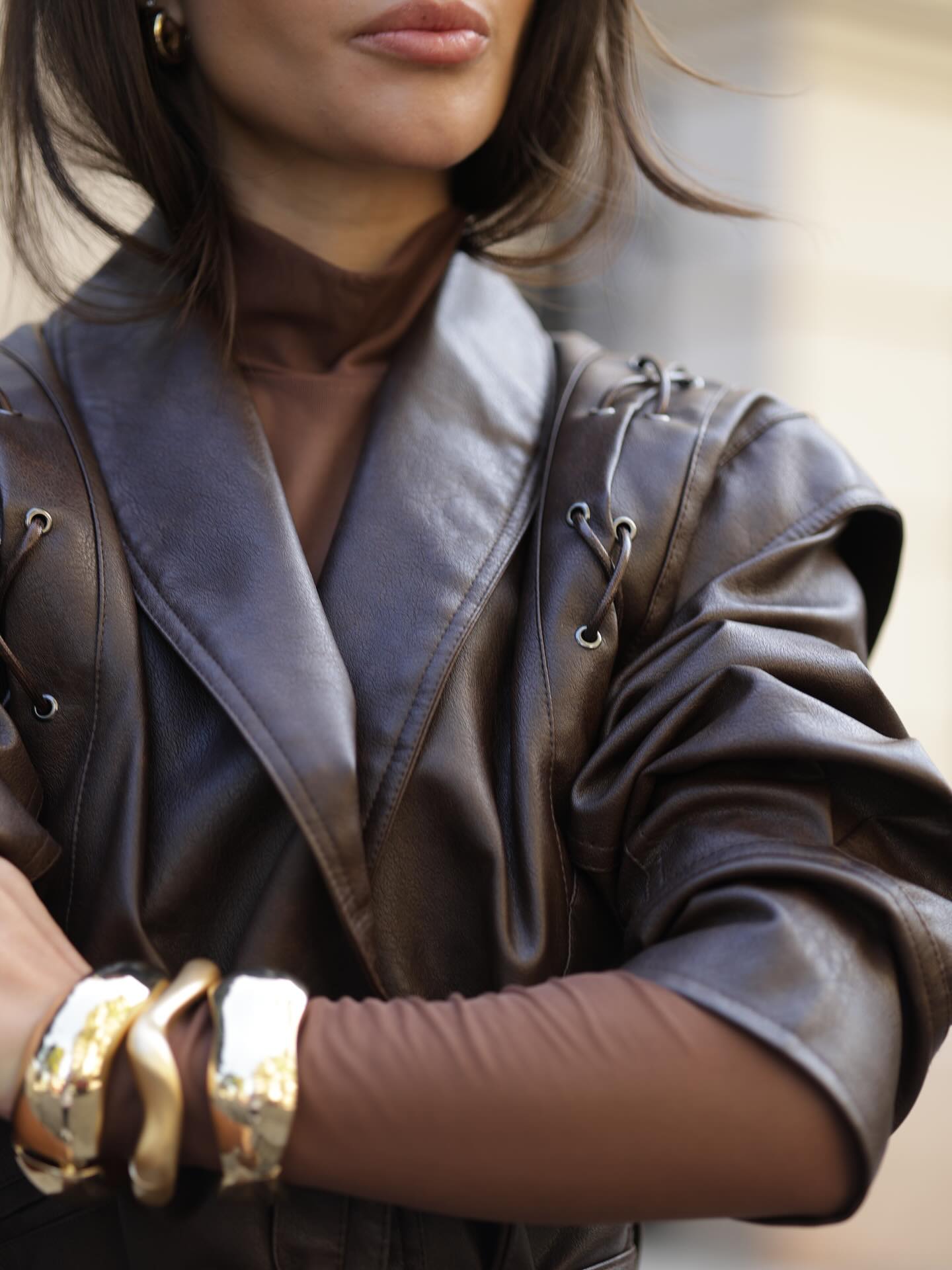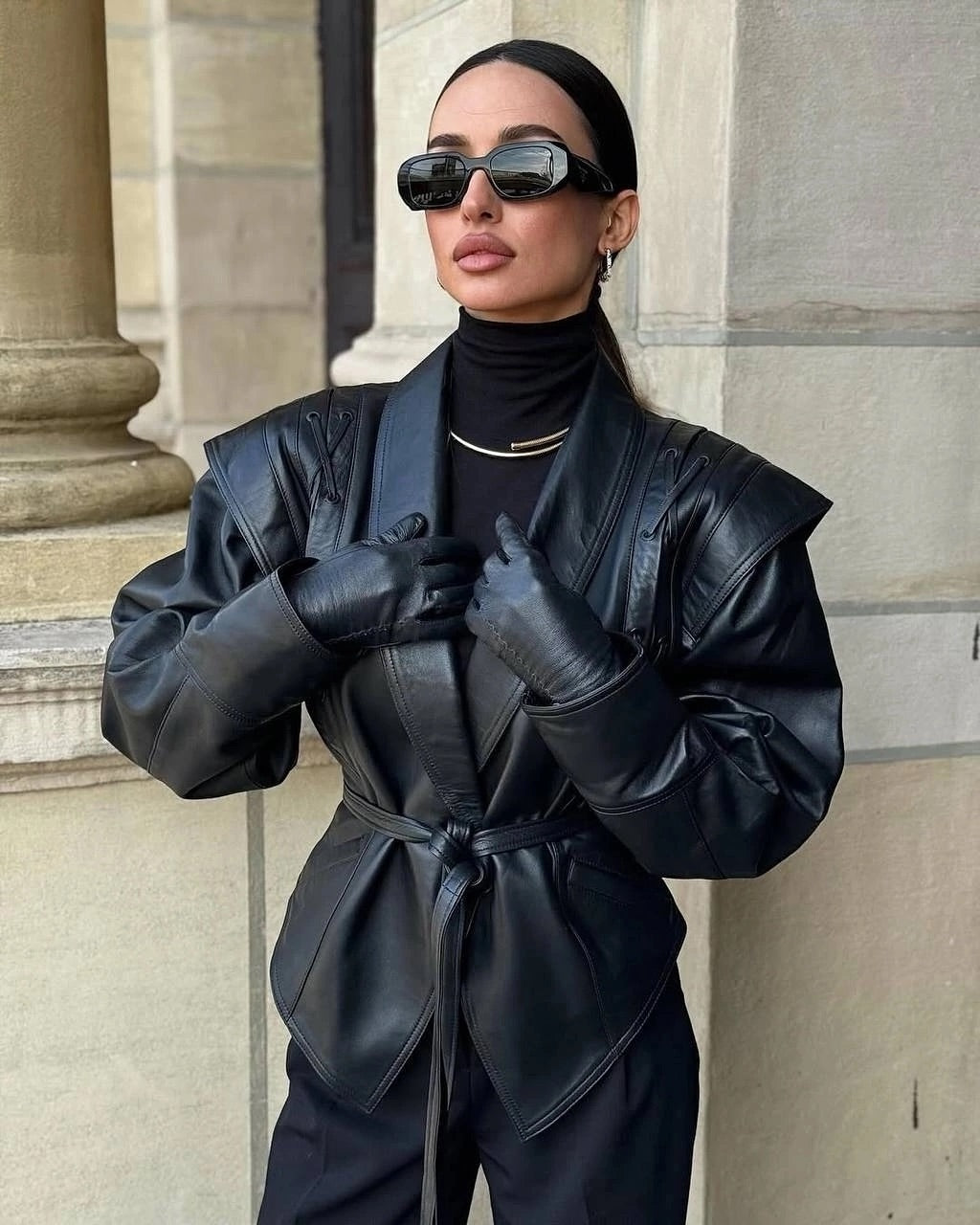 The COUPE jacket is cut from sculpted vegan leather with a soft matte finish and detailed with tonal lace-up stitching along the shoulders and back. Designed with a wide lapel, structured shoulders, and a waist-cinching tie belt, it brings shape and confidence to any look.
