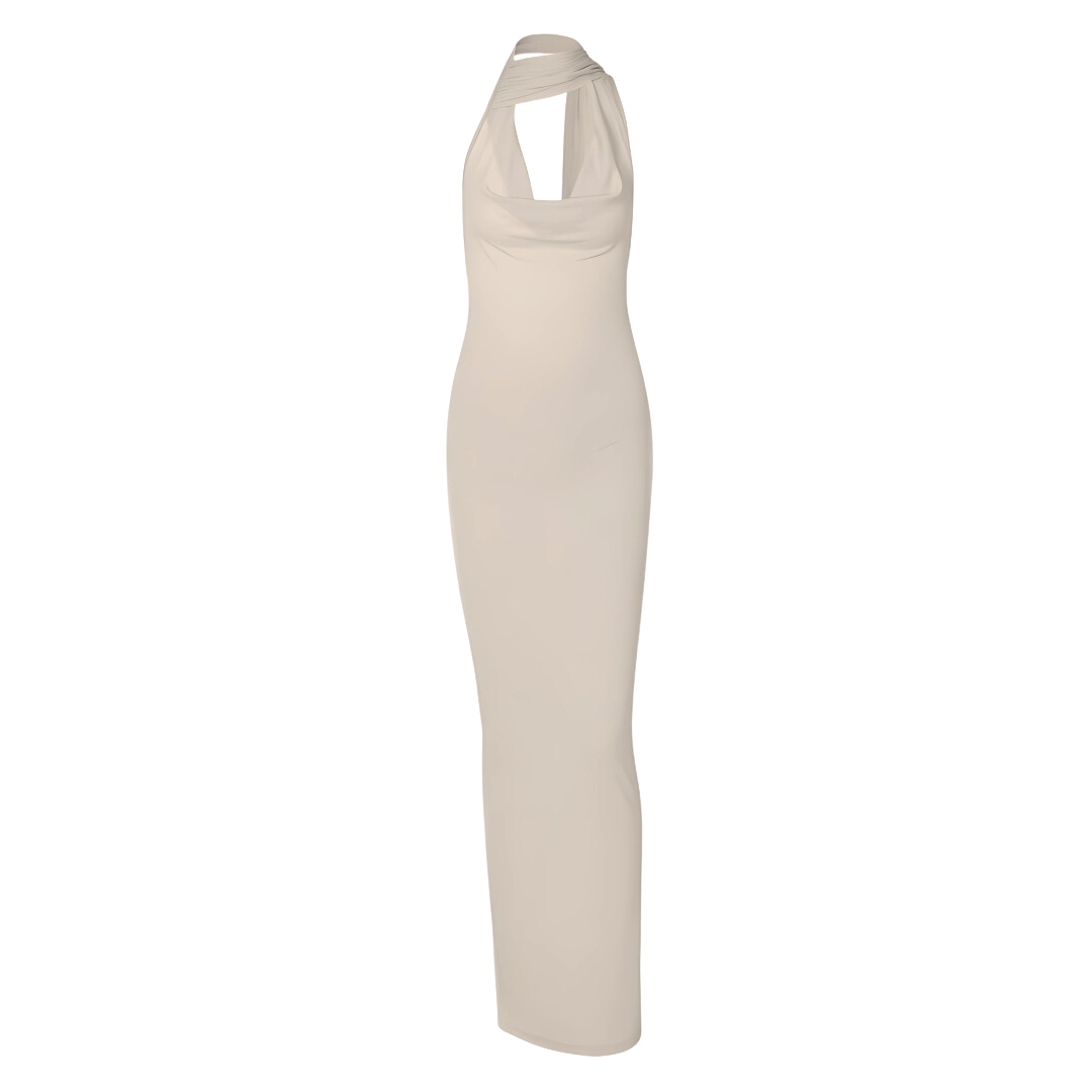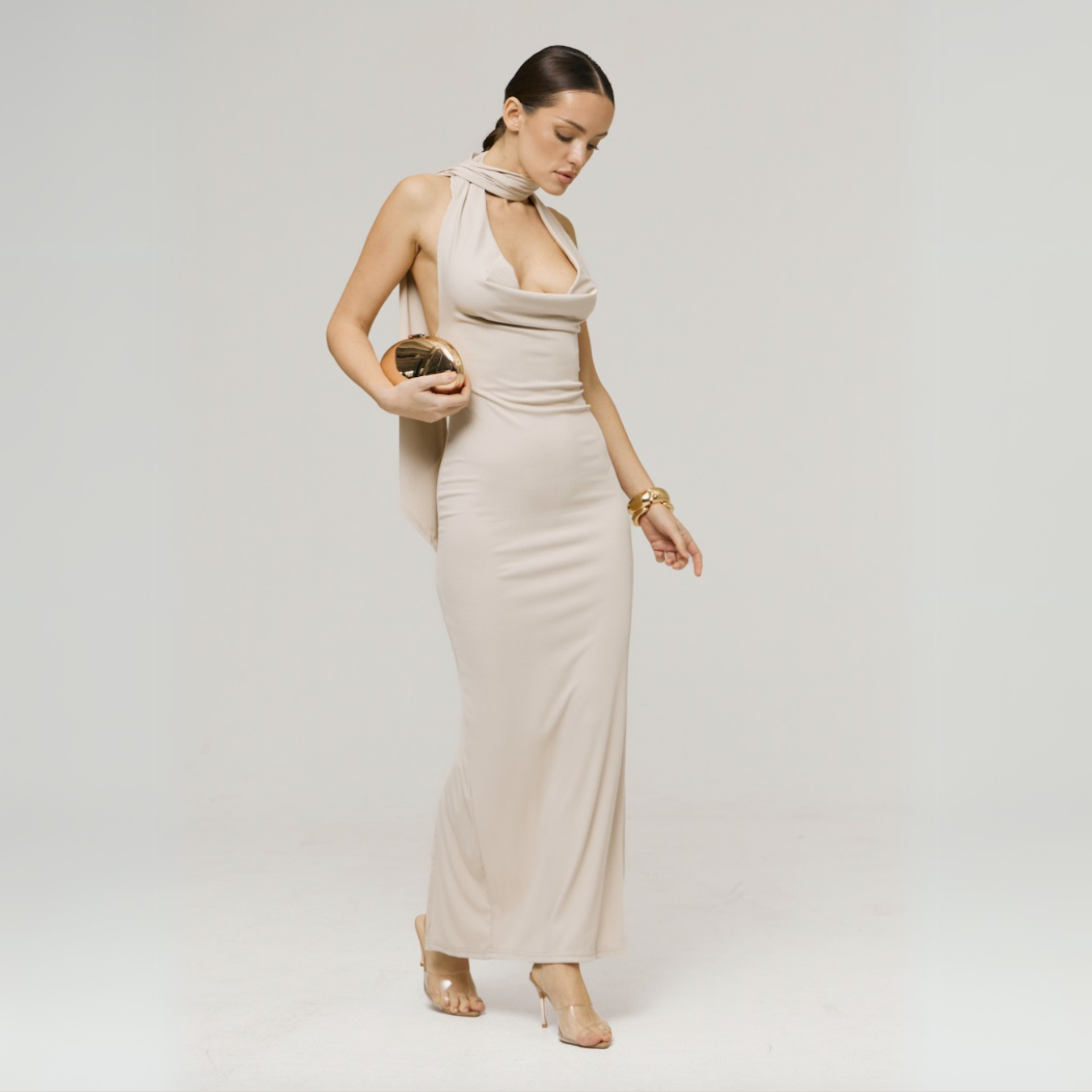 The draped cowl neck adds an element of sophistication, while the attached scarf detail provides a chic, versatile styling option that can be worn in various ways to suit your look. With a halter neck design and a daring back split, this dress is both bold and elegant, making it the perfect choice for a night of glamour and movement.