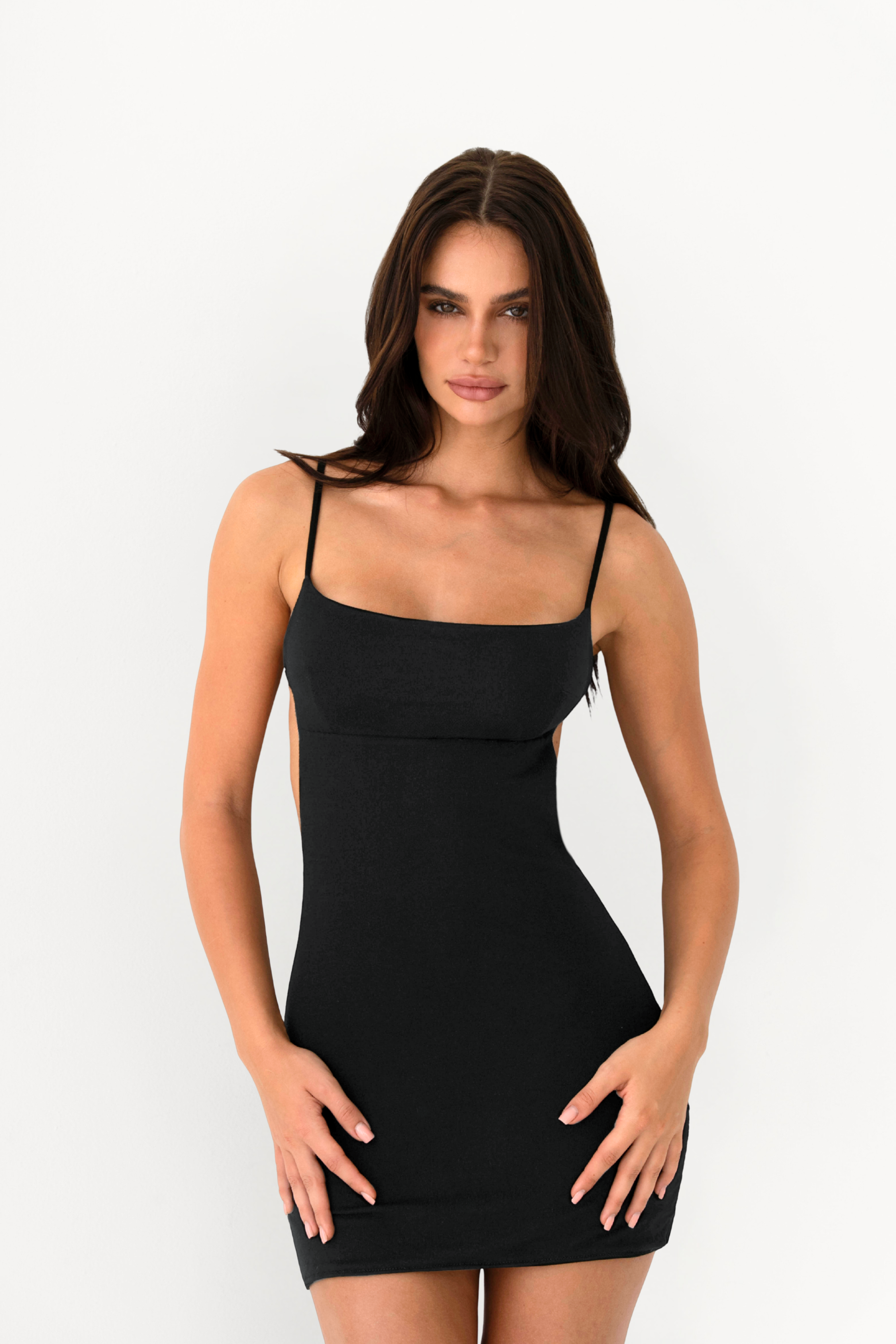 It features a clean neckline, open back with fine elastic straps, and a hidden silicone band under the bust for a secure, seamless fit.