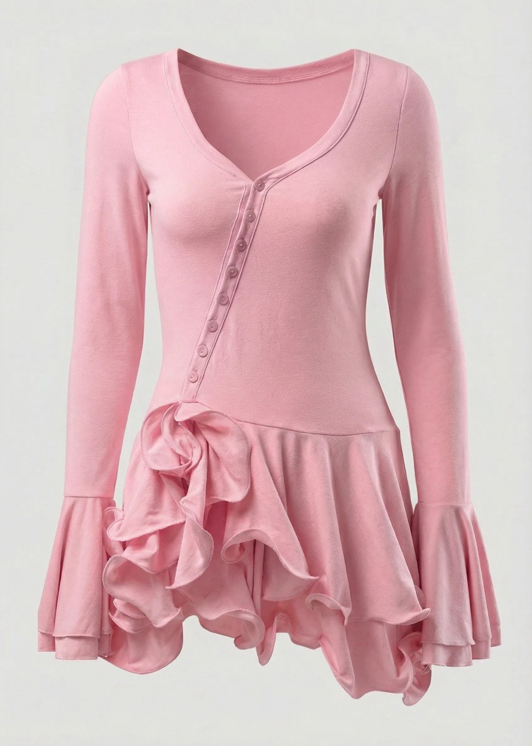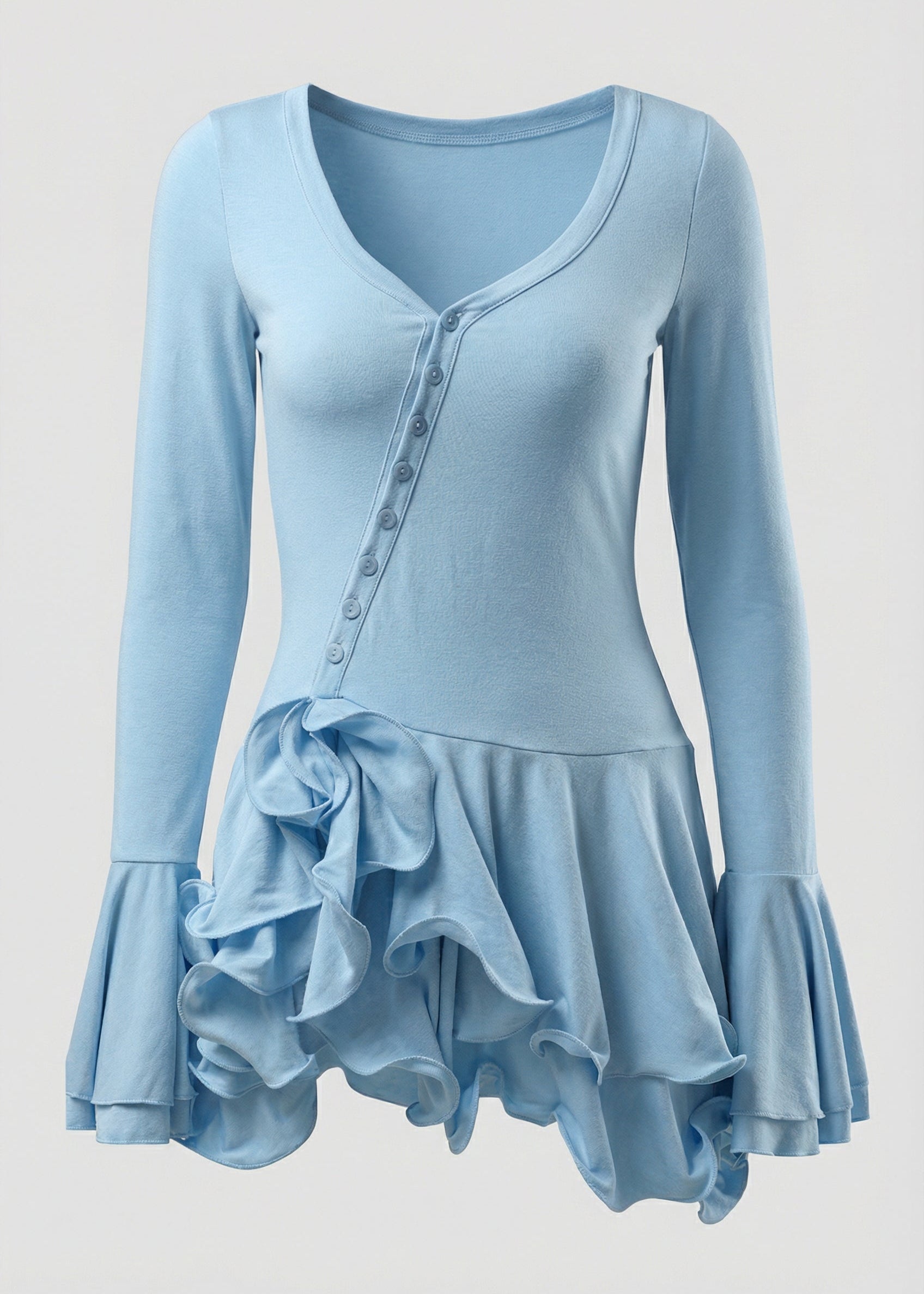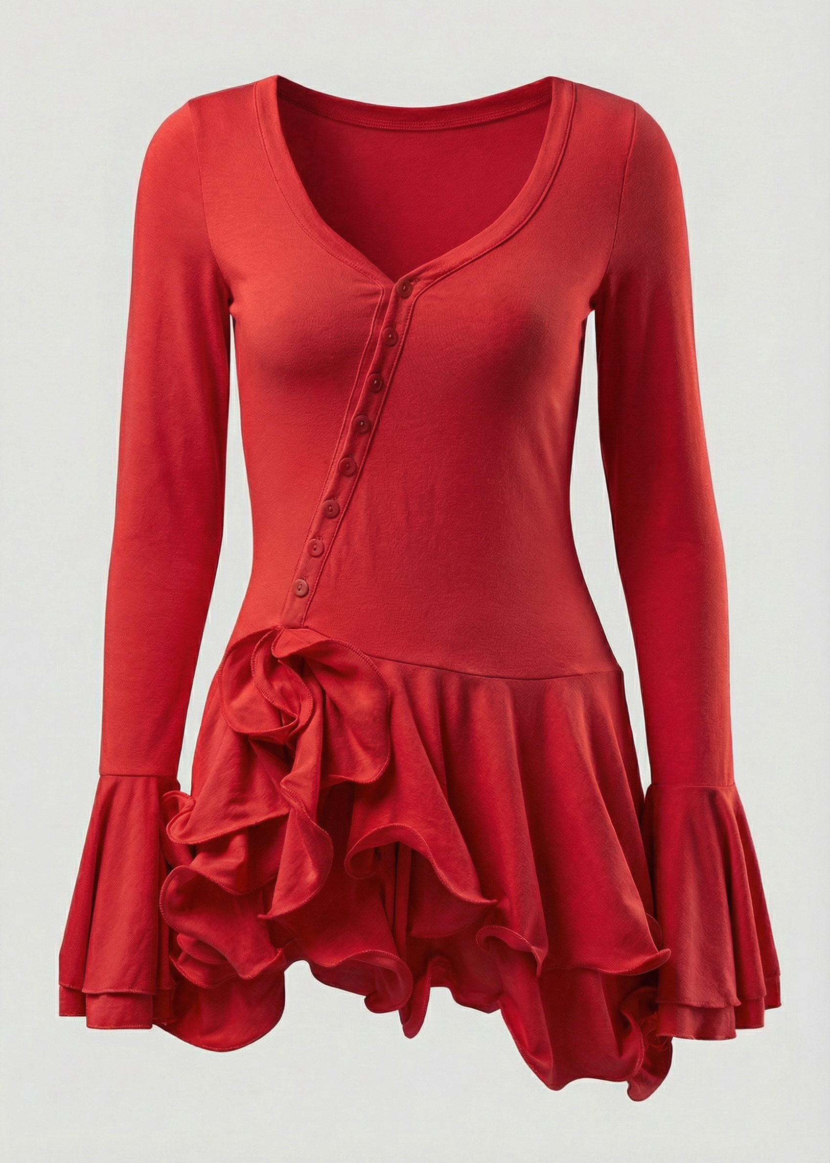 This elegant mini dress features a flattering sweetheart neckline adorned with delicate fabric-covered buttons that create an off-center focal point. The fitted long sleeves transition into voluminous flared cuffs, adding a touch of drama with every gesture. Tiered ruffles at the hem create movement and visual length while you move through your evening. The rich, saturated red hue commands attention and photographs beautifully in low lighting, ideal for date nights and upscale events. Style with strappy heels and a structured clutch for a polished look, or layer with a cropped jacket for added versatility when temperatures drop.