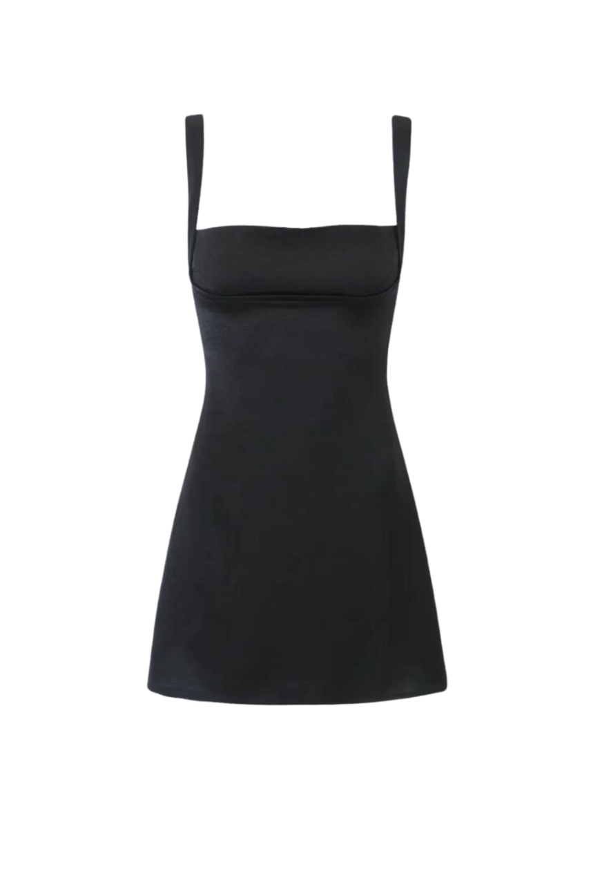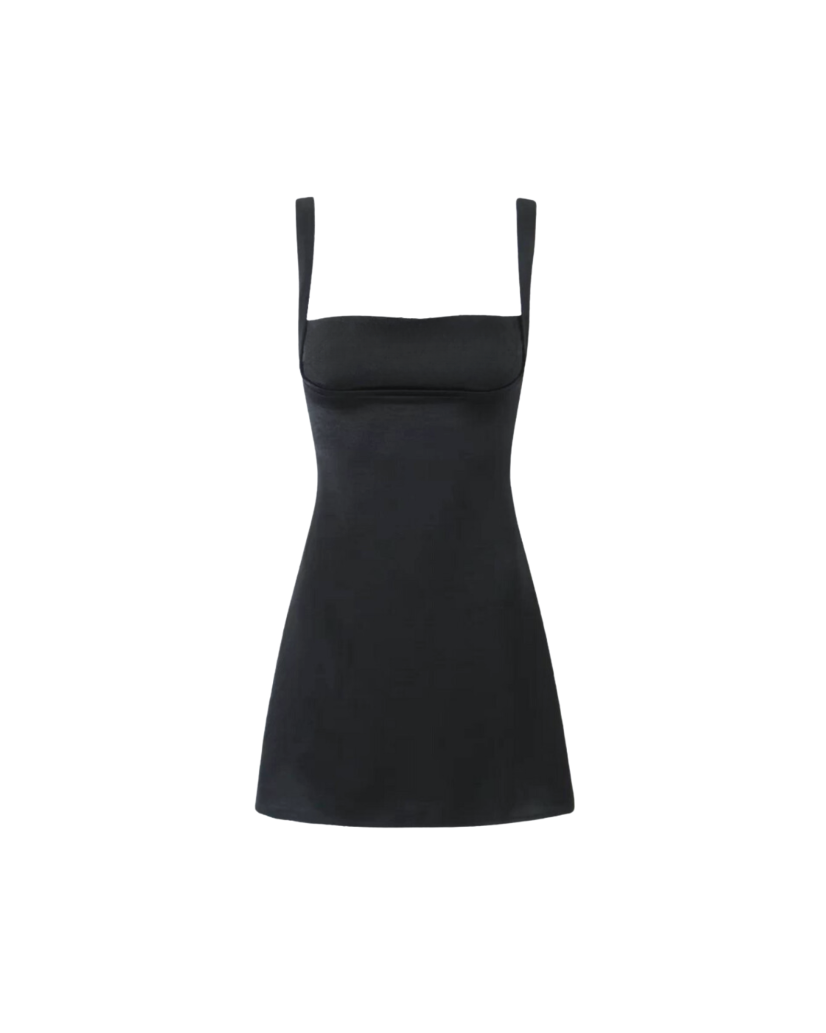 Minimalism with a sensual edge. Crafted from a sleek, satin-like fabric that smooths over your curves with a clean, contoured fit. It features a soft balconette neckline that flatters the bust and wide straps for a balanced, sculpted look. Fitted through the bodice with a subtle flare at the hem, it's the perfect piece for a sleek, elevated night out.