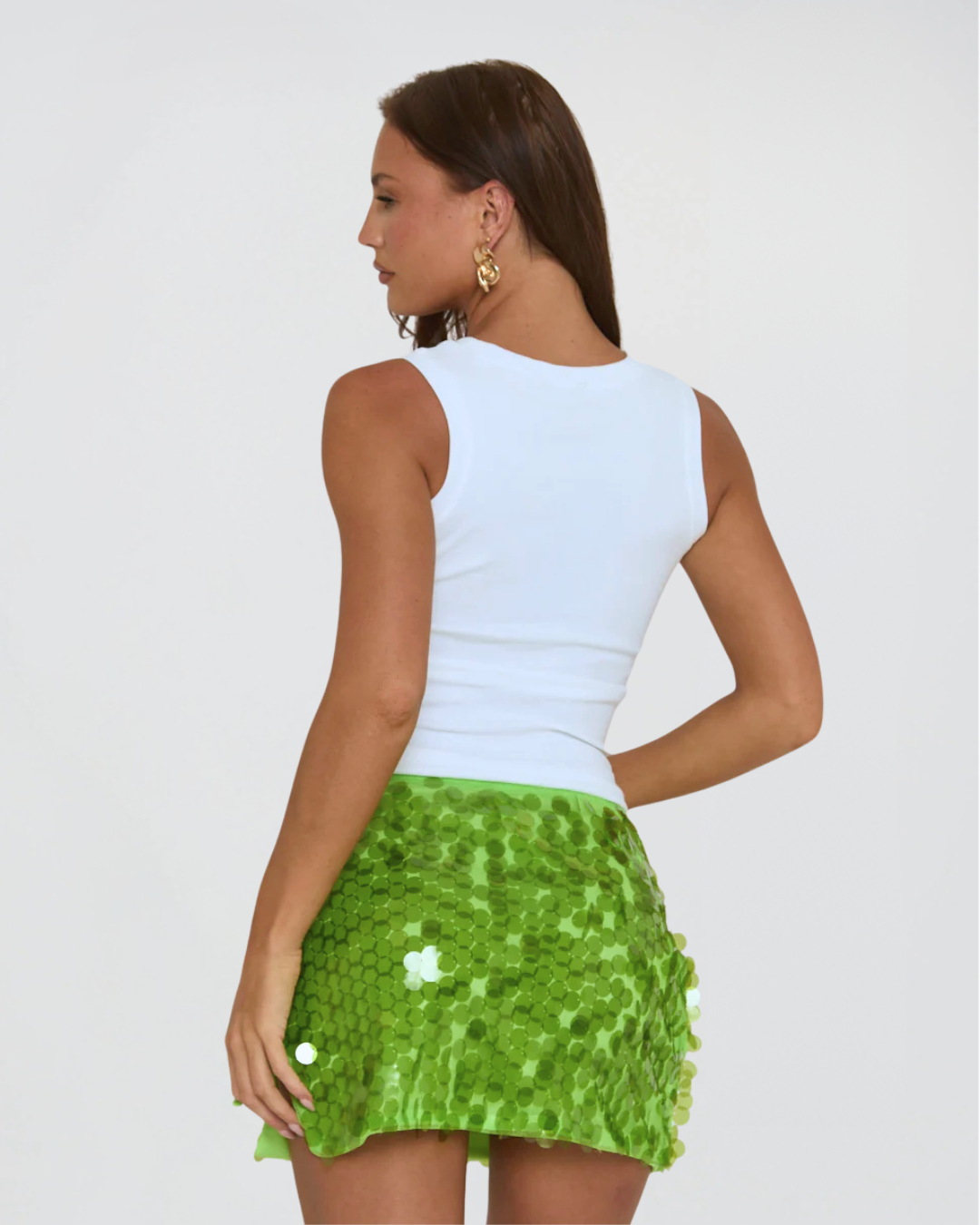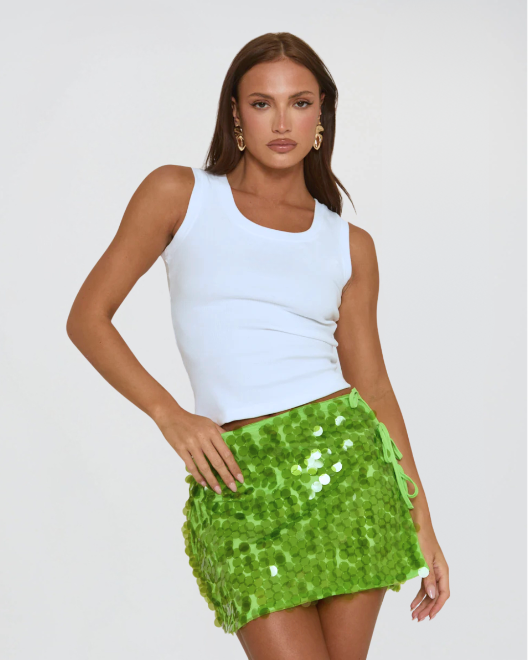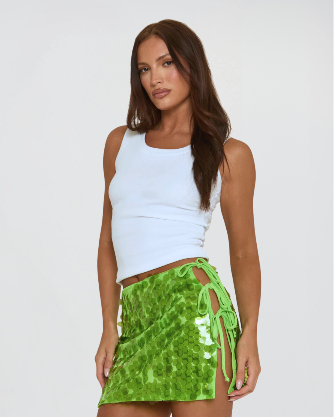 A little sparkle goes a long way. This low-rise statement mini skirt is covered in oversized iridescent sequins that catch the light from every angle. Designed with a flattering adjustable side-tie and a stretch jersey lining for comfort, it’s the ultimate piece for summer parties, beach nights, and everything in between. Pair it with a simple tank or dress it up with heels — either way, you’ll steal the spotlight.