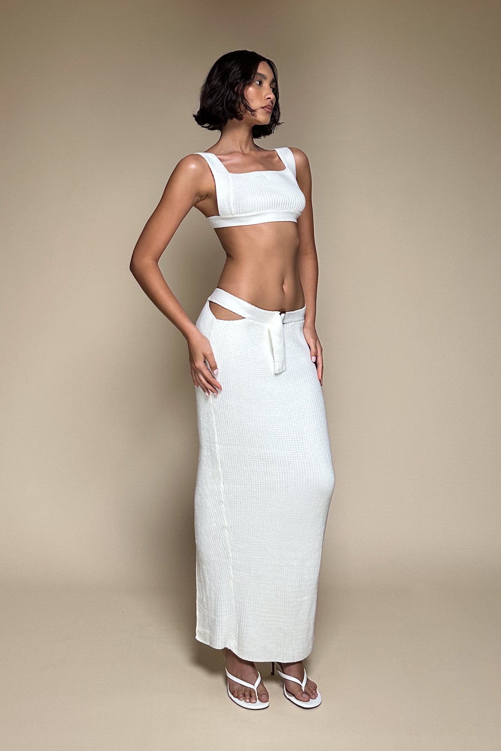 ANGELOU is an exquisitely composed two-piece set. This form fitting skirt set features a lovely crop top cut with a squared neckline, fixed shoulder straps, and an open back detailing a squared bamboo buckle. The matching maxi skirt comes with a pencil silhouette, cut-out sides at the hip, and a squared bamboo buckle. Stretchy. Split back hem.