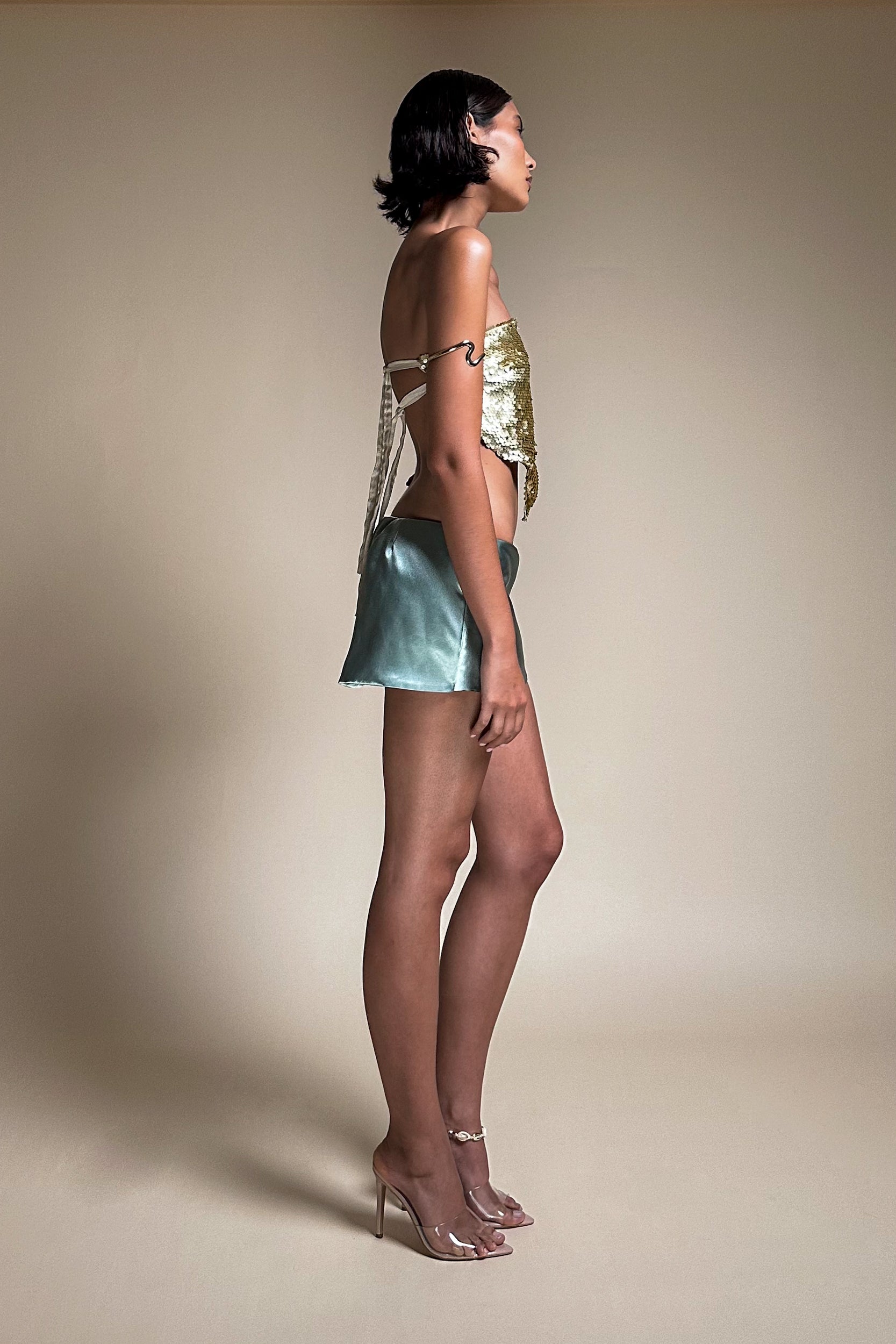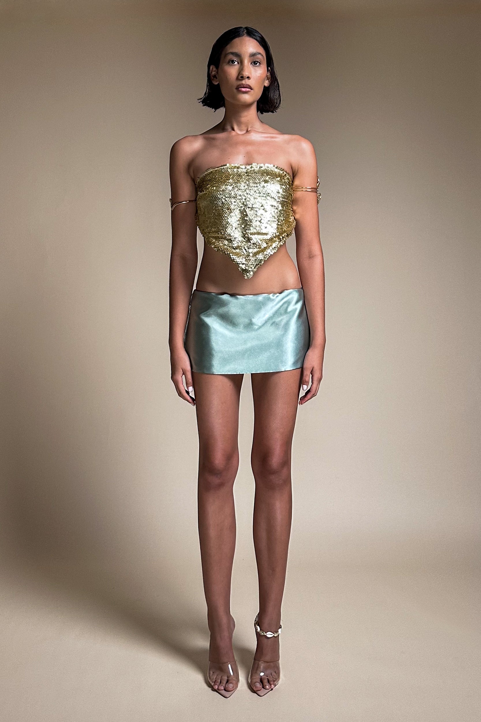 Golden hour energy, all night long. This backless sequin bandeau top features a striking scarf-cut front and adjustable tie-back design that lets you wear it your way. Lightweight yet bold, it’s made to reflect every flicker of light and elevate any party look.