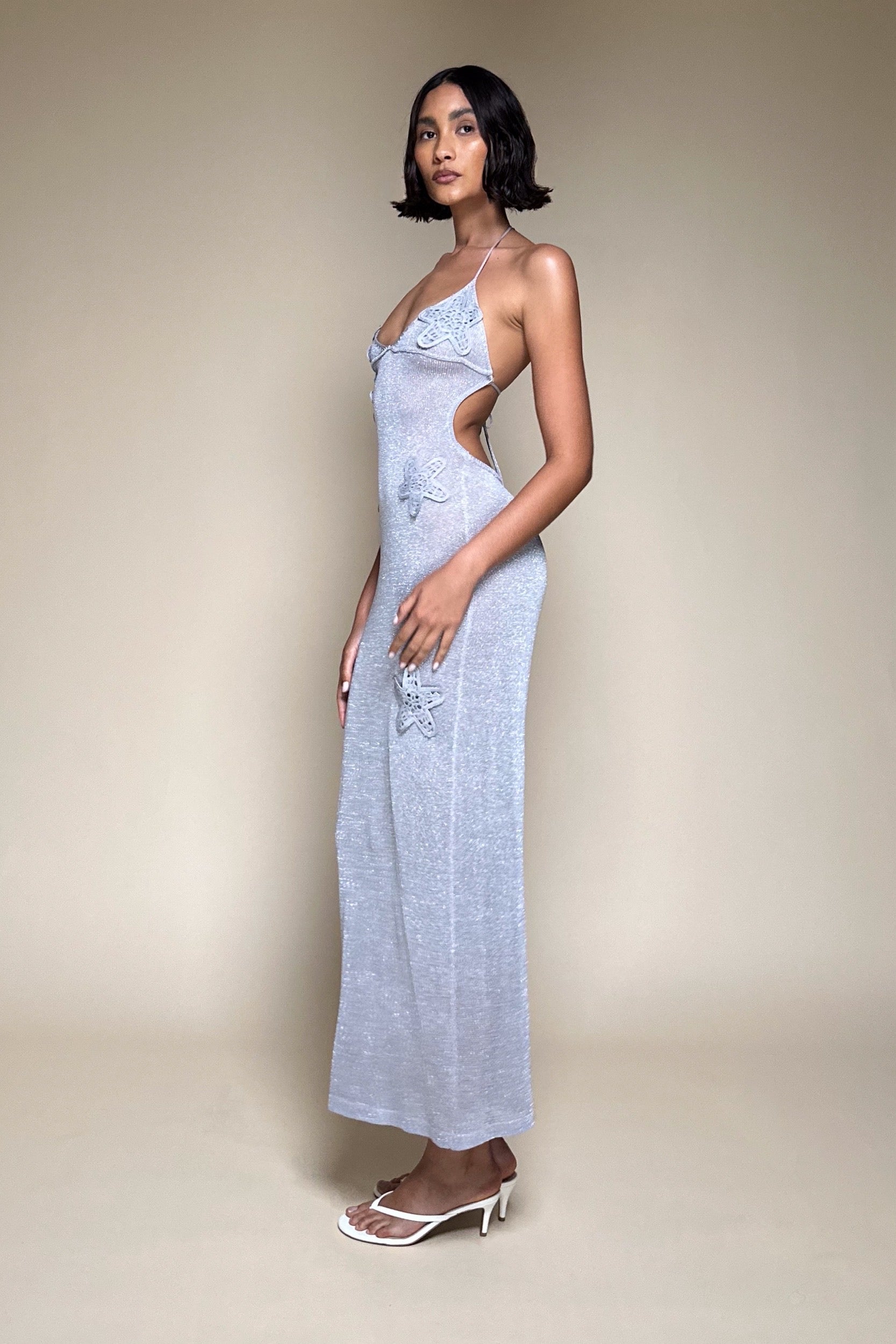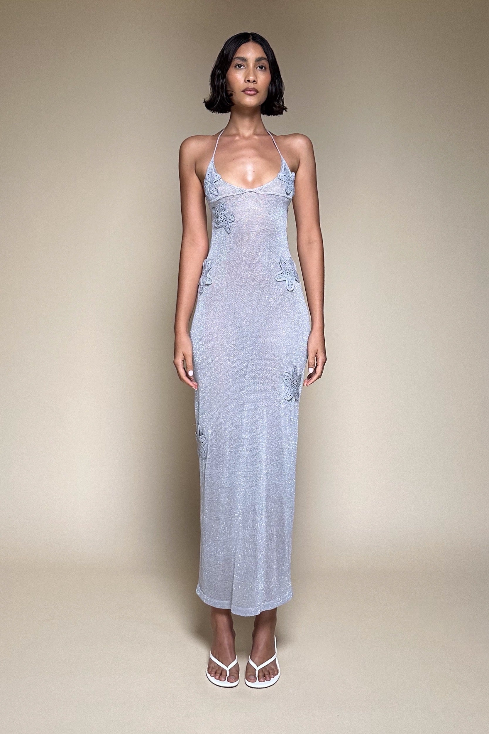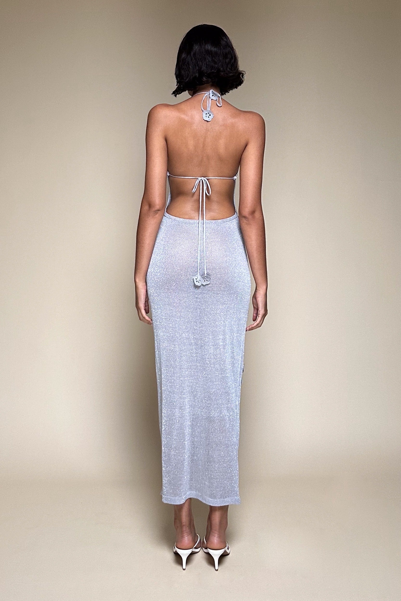 The SÉDUITE Maxi is spun from glistening silver lurex knit that clings to every curve and catches the light like a second skin. Featuring a daring halter neckline, backless silhouette, and delicate floral appliqué details, this sheer bodycon gown is pure seduction — effortless, elegant, and designed to mesmerize.