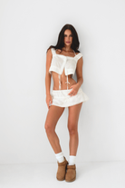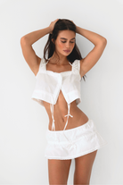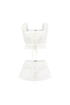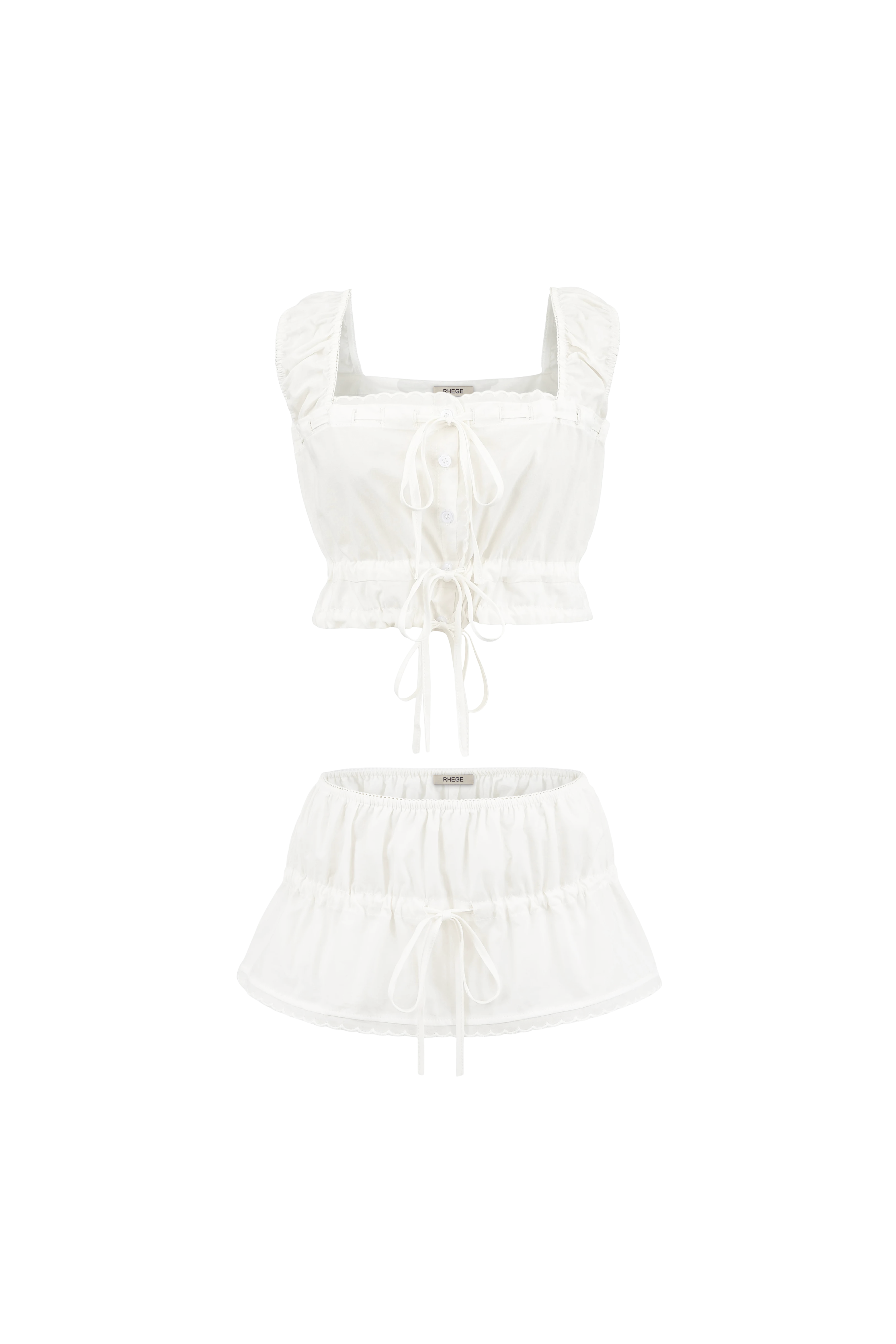The cropped top buttons down with scalloped edges and tie details. The matching micro skirt sits low on the hips, gathered just enough, with built-in cotton shorts underneath.
