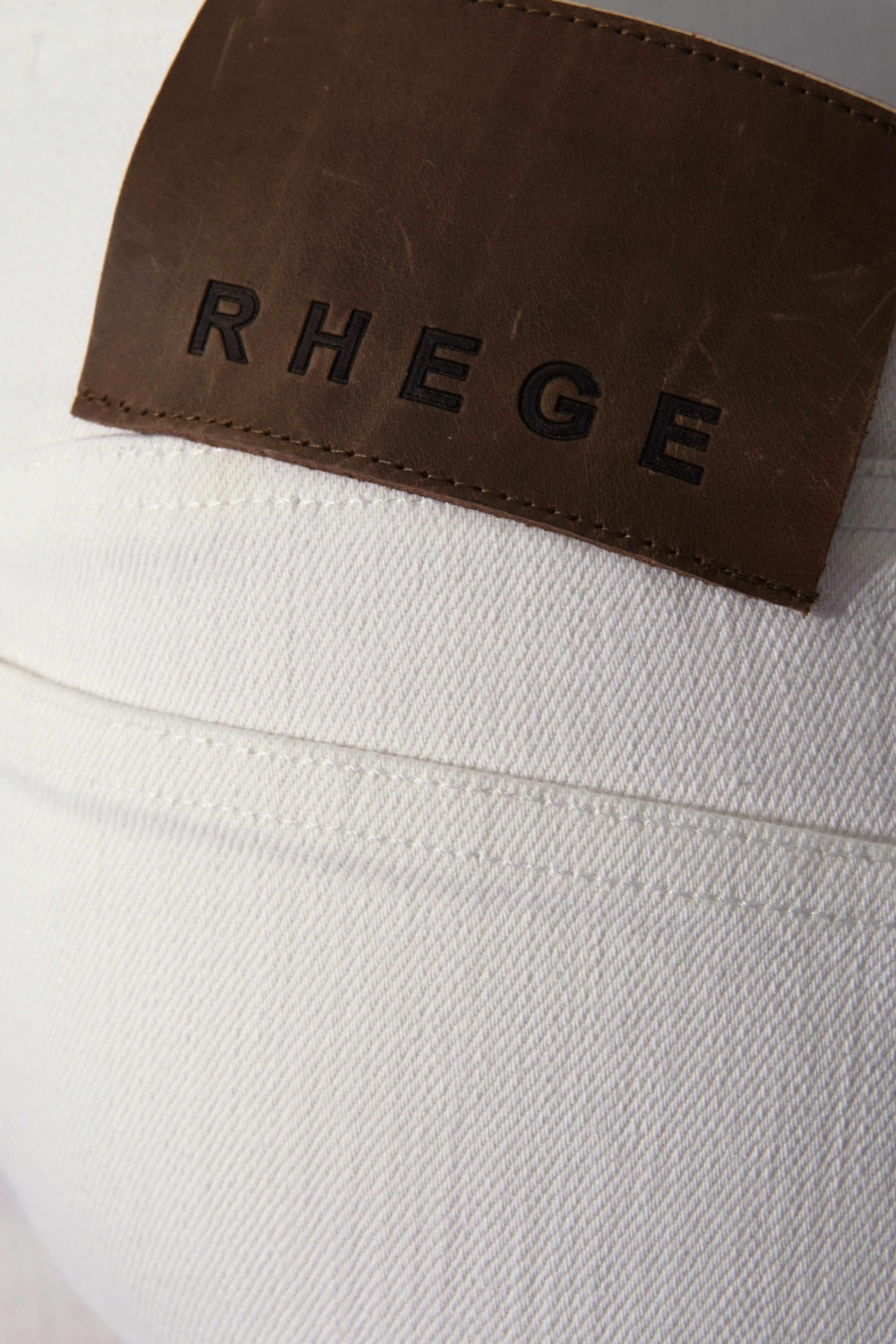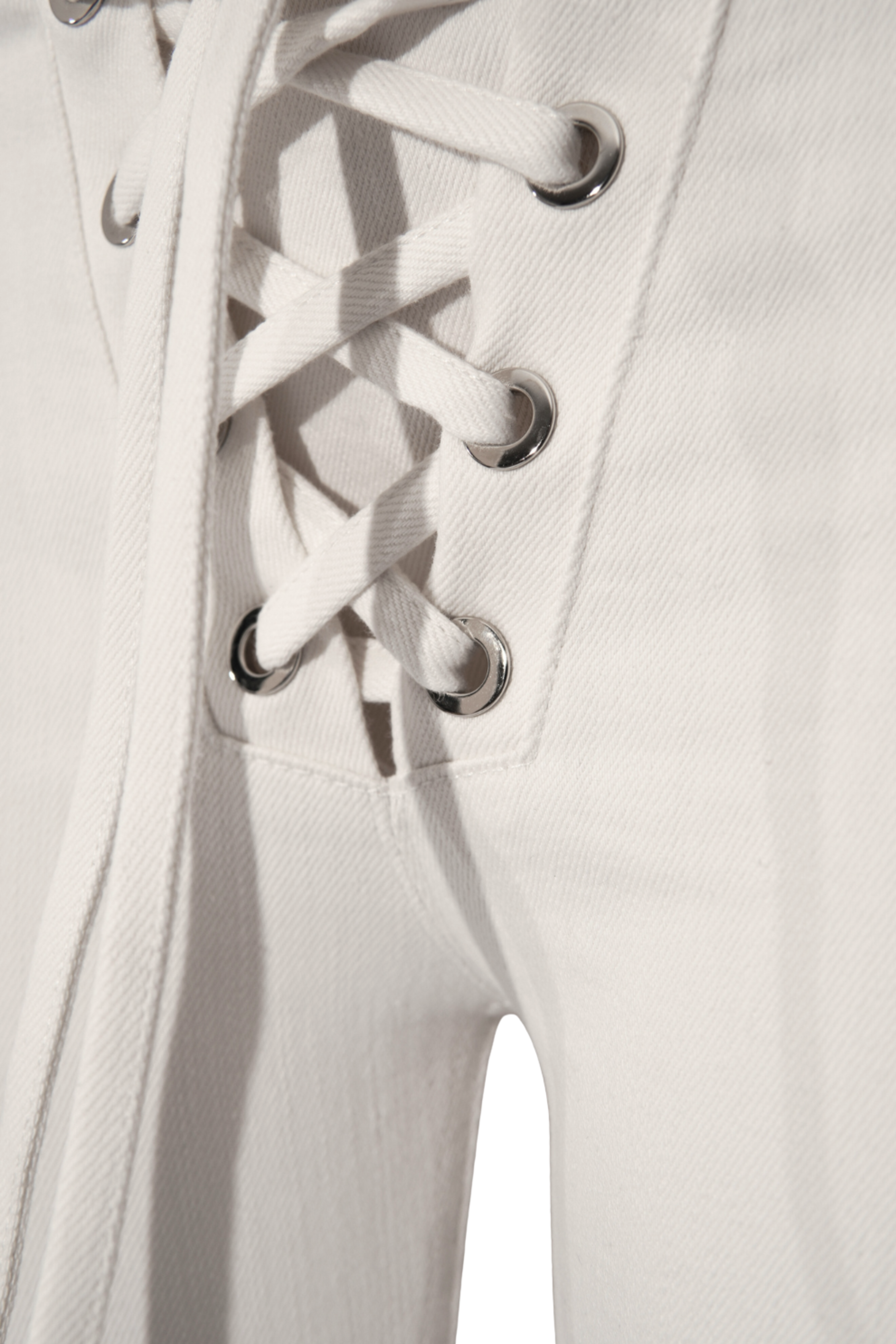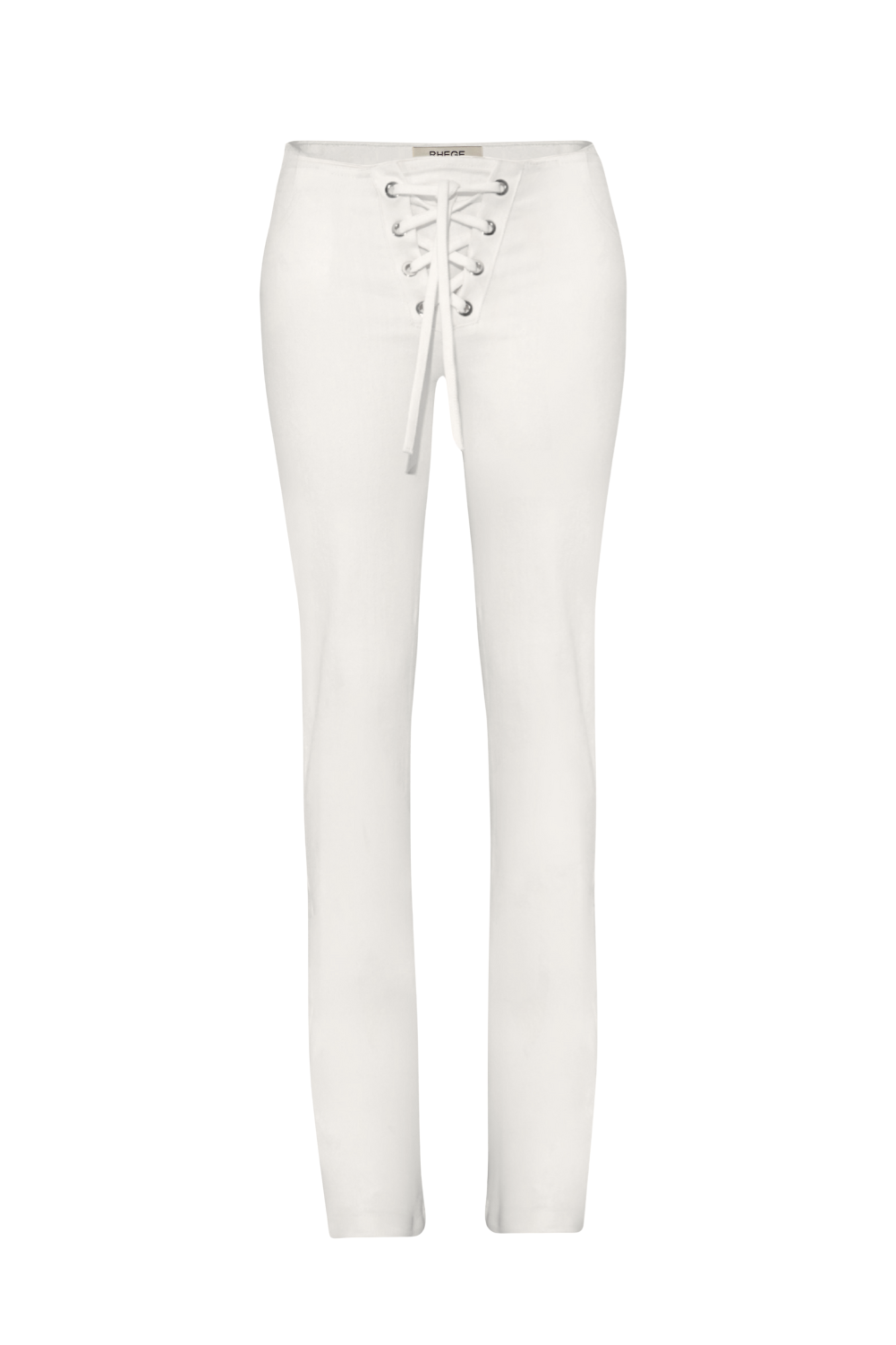 Low-rise white denim pants with a front lace-up detail and silver grommets. Made from structured stretch cotton denim for a smooth, sculpted fit. Finished with a genuine leather Rhege patch at the back.