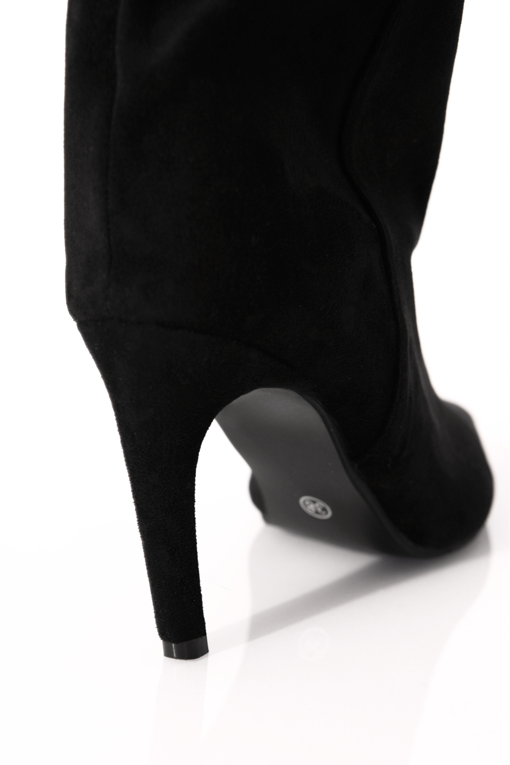 A soft, slouchy knee-high boot made from black suede. The pointed toe and slim, slightly curved heel give the leg a long, clean line. The shaft folds naturally around the calf without looking bulky. Lightweight, easy to pull on, and flattering with almost anything.