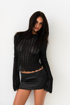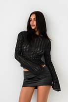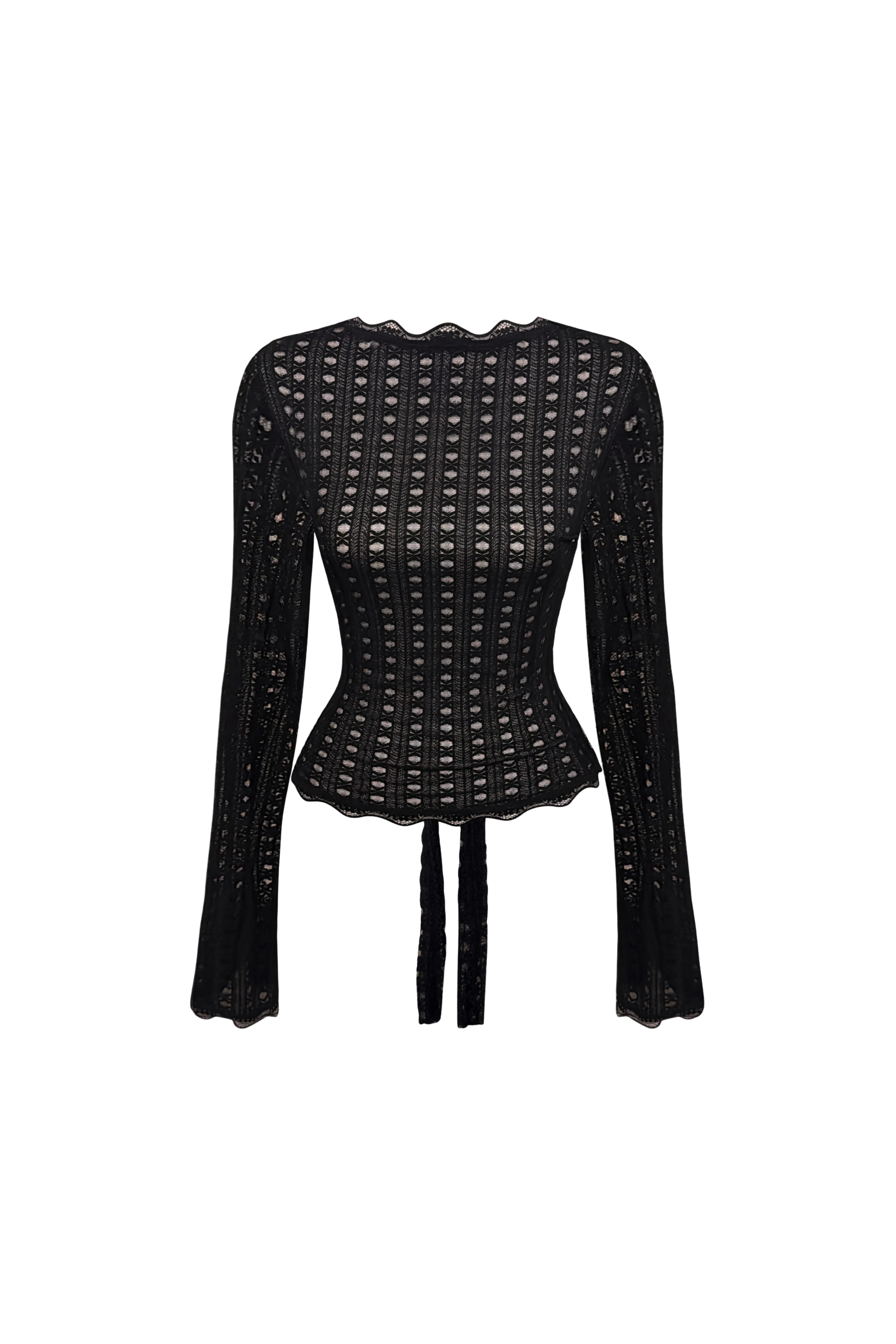 Made from soft stretch lace, it drapes close to the body with long flared sleeves and tie-back detail that reveals just enough skin.