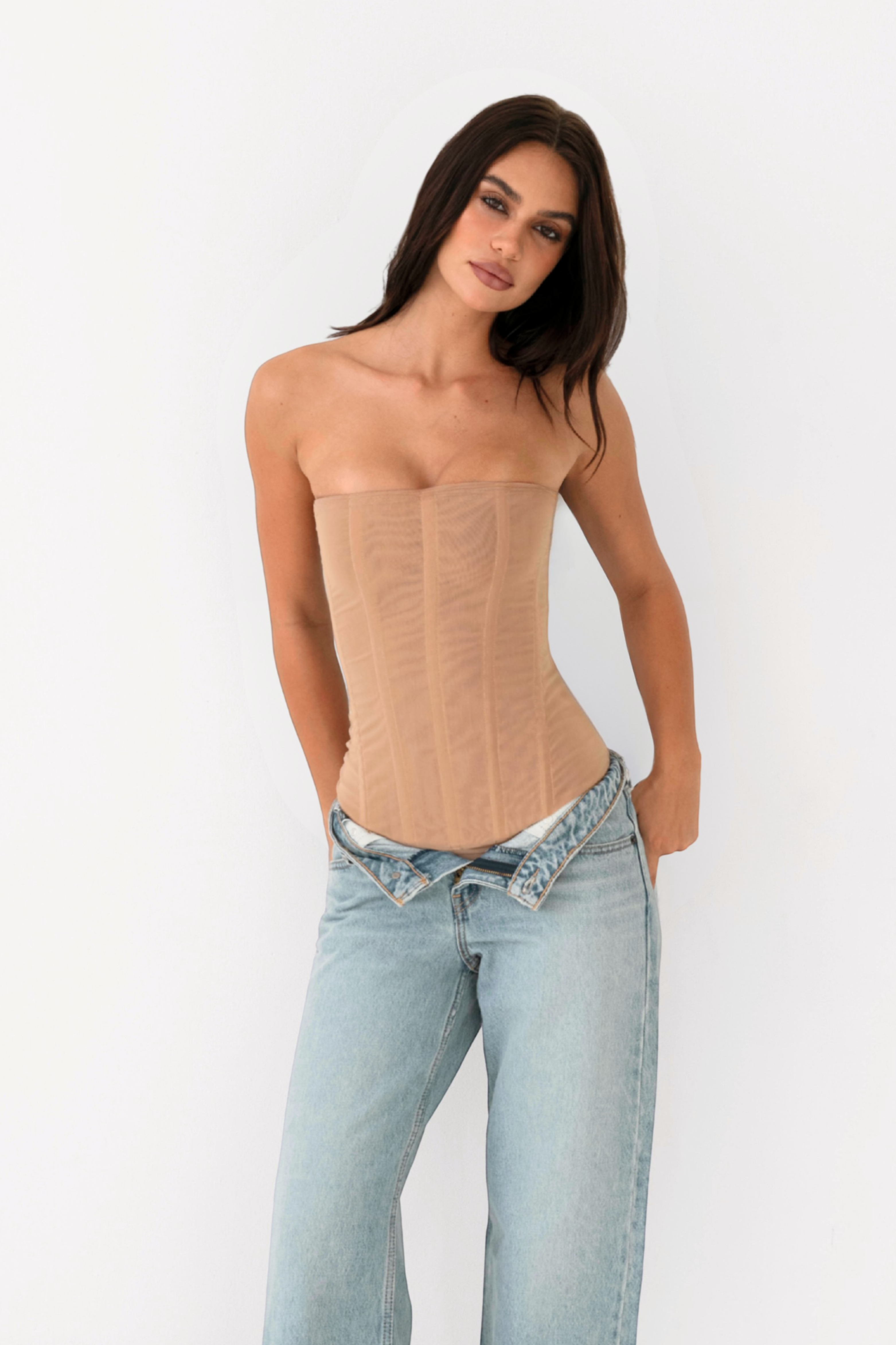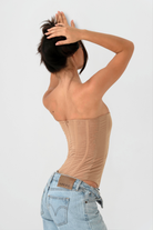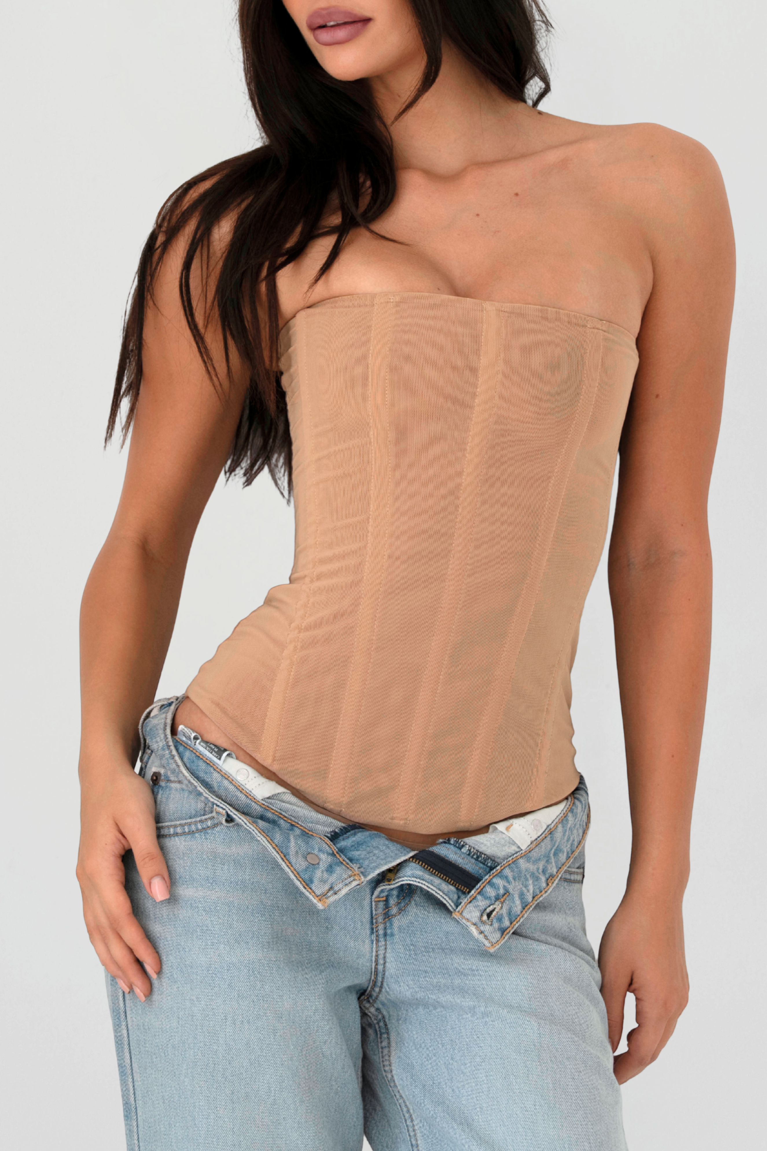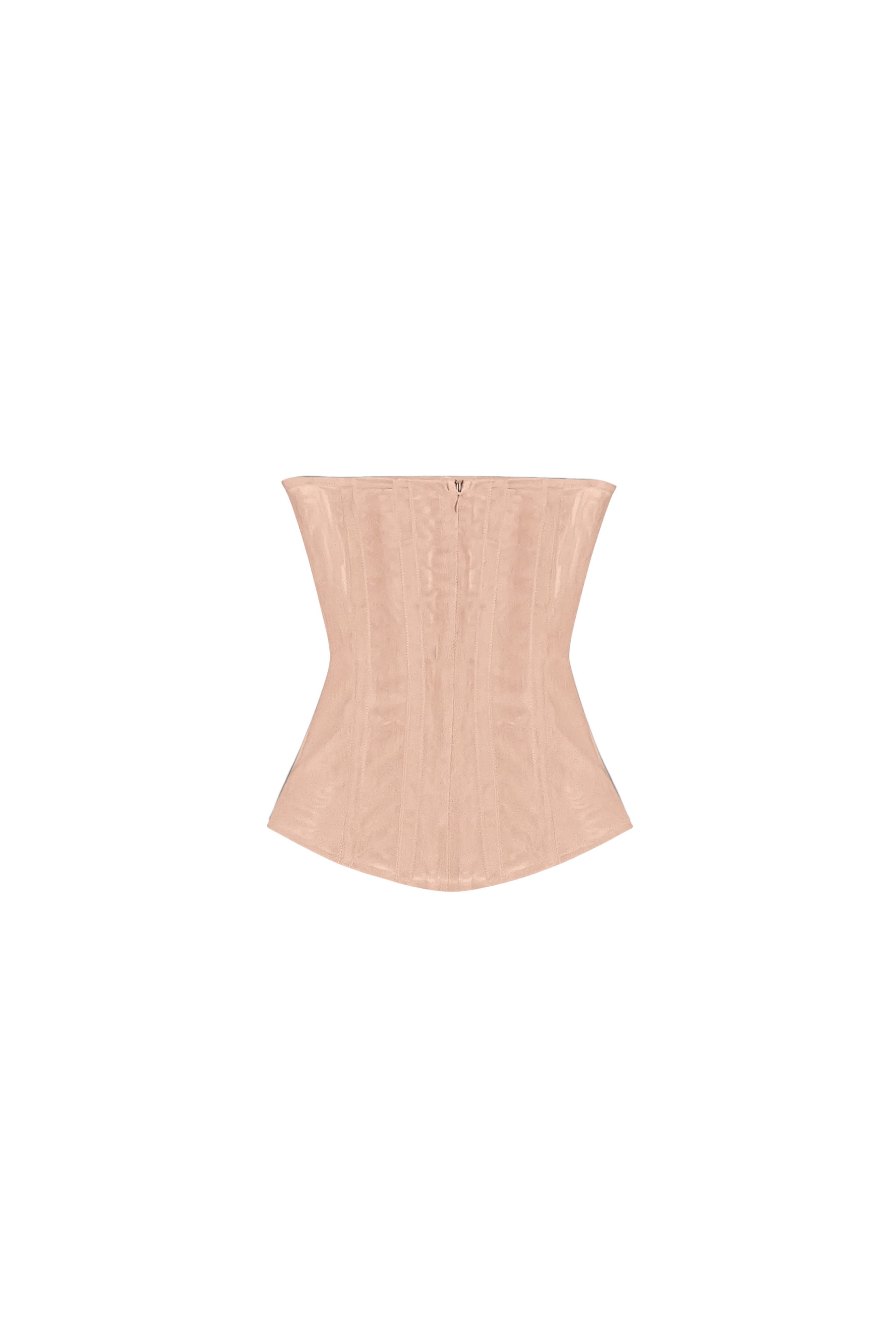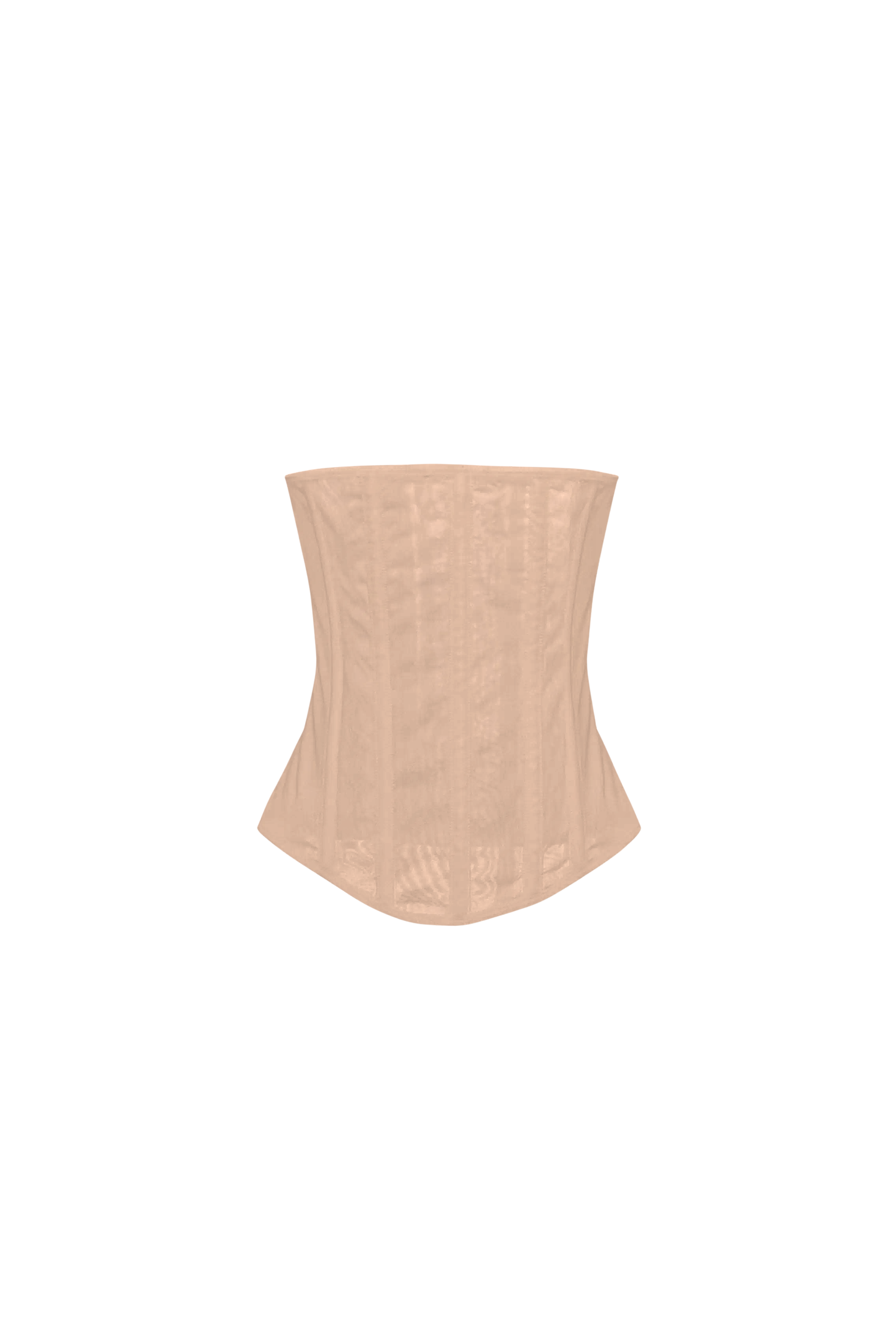 A fully boned power mesh corset featuring a back zipper detail for a perfectly cinched waist. Designed to sculpt and define with refined structure and a seamless fit.