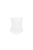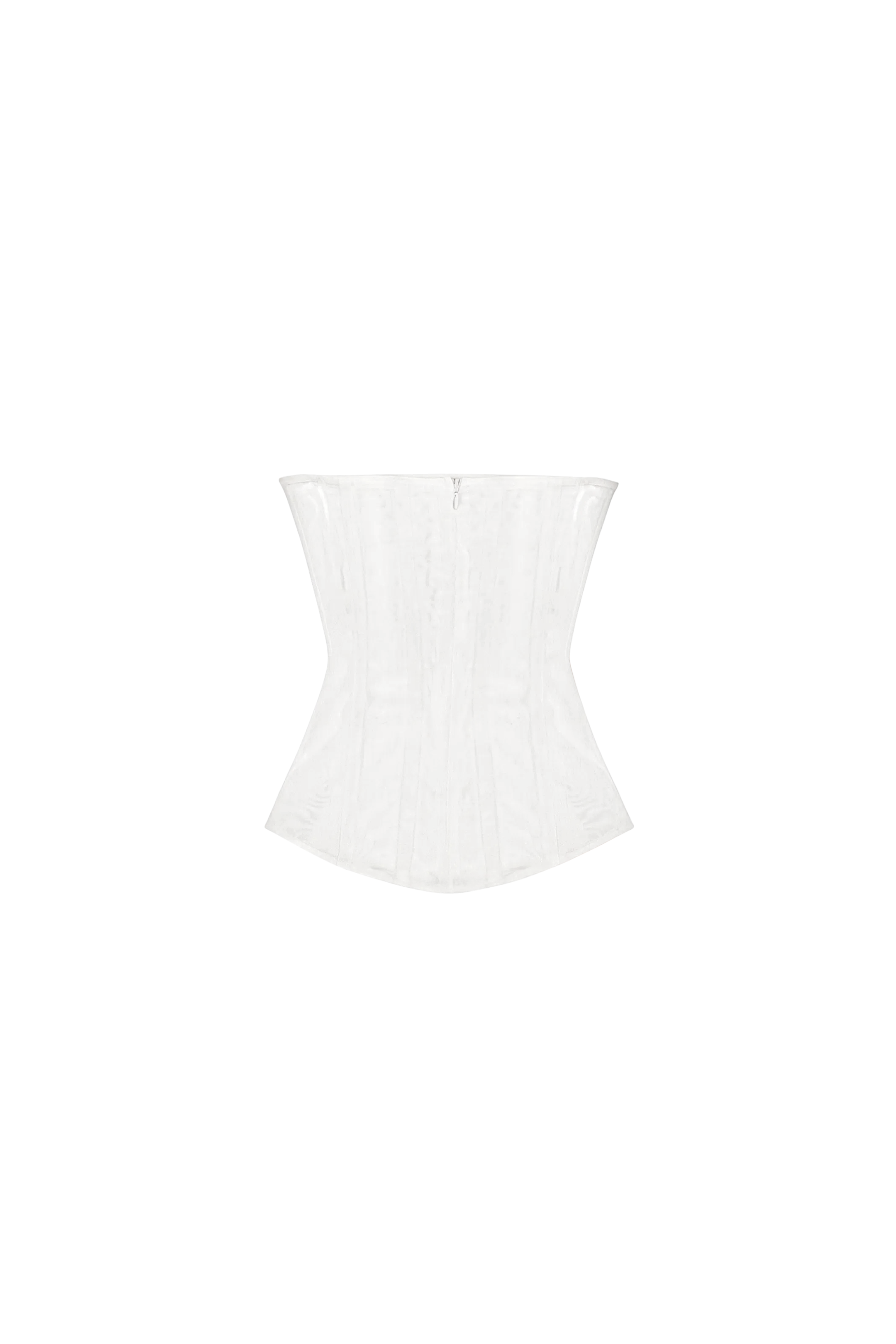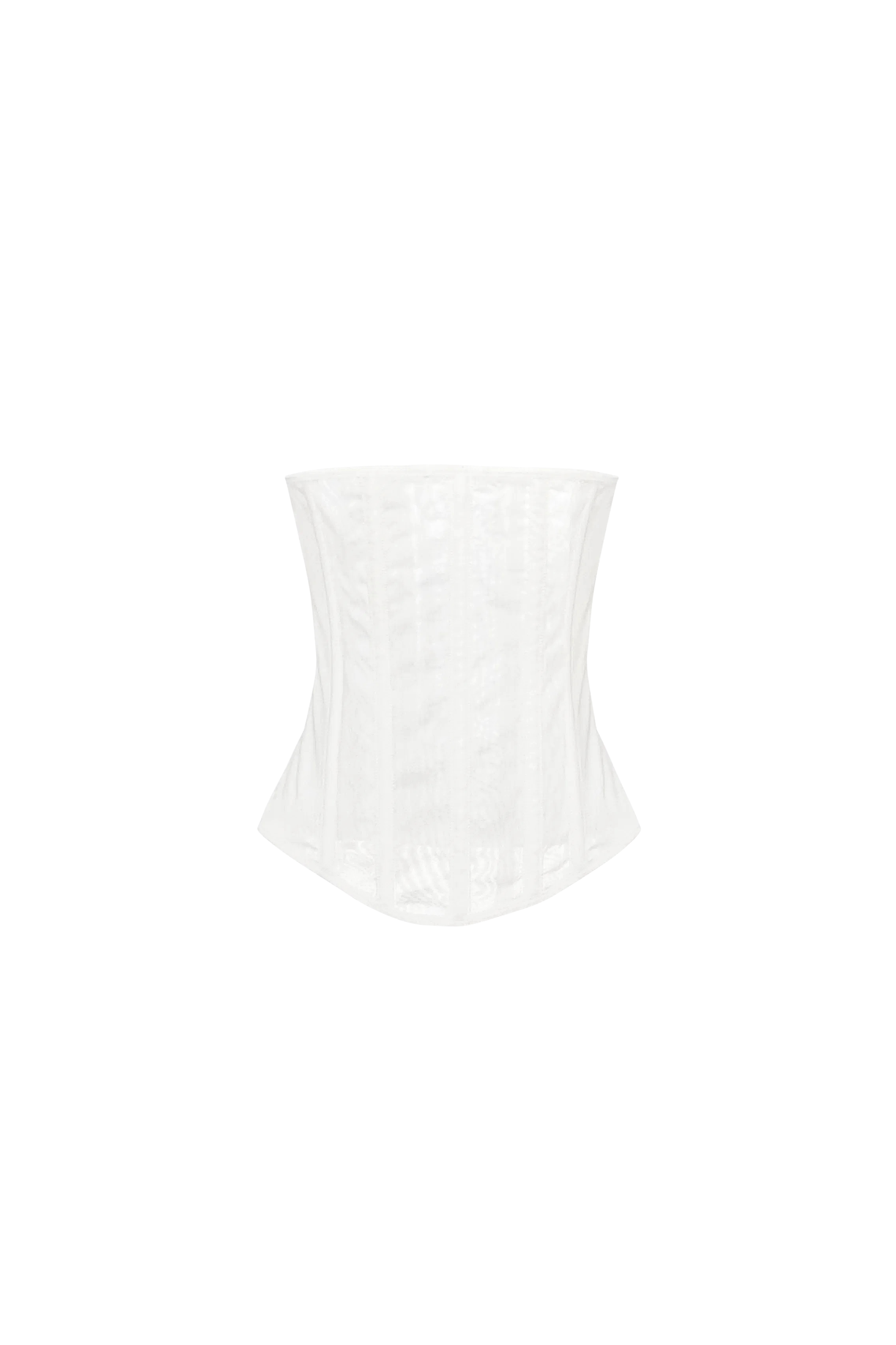 A true closet hero. Fully boned white mesh corset top with a back zipper for a sculpted, refined fit. Designed to cinch, shape, and flatter every curve.